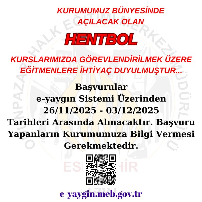 Odunpazarı Halk Eğitim Merkezi bünyesinde açılması planlanan Hentbol ve Walk (Yürüyüş) kurslarında görevlendirilmek üzere eğitmen ihtiyacı doğdu.