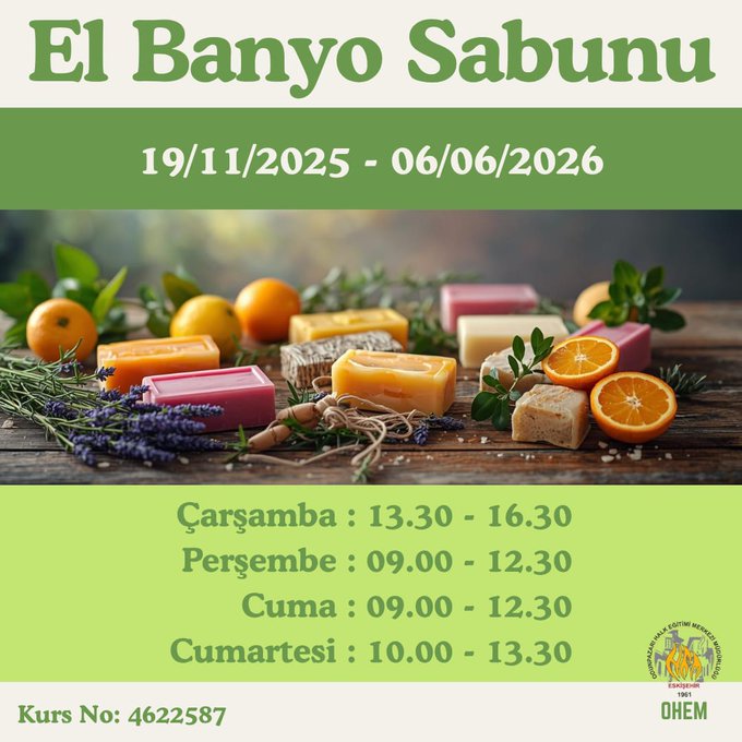 Kurumdan yapılan duyuruya göre El Banyo Sabunu Kursu, 19 Kasım 2025 Çarşamba günü başlayacak.