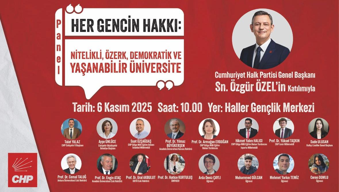 CHP Genel Başkanı Özgür Özel, Eskişehir'de gerçekleştirilecek olan “Her Gencin Hakkı: Nitelikli, Özerk, Demokratik ve Yaşabilir Üniversite” paneline katılacak.