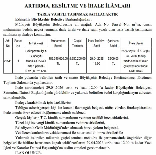 Arsa için belirlenen muhammen bedel 189 milyon 340 bin TL olurken, ihaleye katılmak isteyenlerin 5 milyon 680 bin 200 TL geçici teminat yatırması gerektiği belirtildi. İhale, 29 Nisan 2026 tarihinde saat 15.00’te Büyükşehir Belediyesi Encümen Toplantı Salonu’nda kapalı teklif usulüyle yapılacak. Şartname, ihale gününe kadar saat 12.00’ye kadar belediyenin Satınalma Dairesi Başkanlığı’nda görülebilecek ve 5 bin TL karşılığında temin edilebilecek.