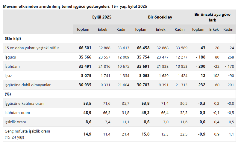 İşsiz sayısı eylülde 3 milyon 75 bin kişiye yükseldi. Bu sayı, bir önceki aya göre 12 bin kişi artış gösterdi. İşsizlik oranı %8,6 seviyesinde sabit kaldı. Erkeklerde işsizlik oranı %7,4, kadınlarda ise %11,1 oldu. İşgücüne dahil olmayan nüfus 30 milyon 935 bin kişiye çıktı. Bu kategoride bir önceki aya göre 232 bin kişilik artış kaydedildi.