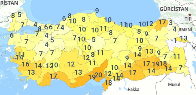 Verilerde 15 şehir öne çıktı. Listeye Eskişehir'de 5 derece Türkiye'nin bugün en soğuk şehirlerine arasında yer aldı. Ayrıca Eskişehir'in komşu şehirlerinden olan Kütahya ve Bilecik'te 4 derece ile listede yerini aldı.