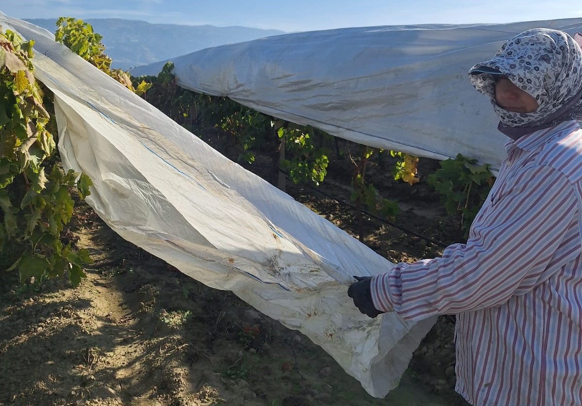 Temmuz ayında üzümleri dolu, aşırı güneş ve yağış gibi olumsuz hava şartlarına karşı korumak için serilen örtüler, üreticiler tarafından toplanarak depolara kaldırılıyor.