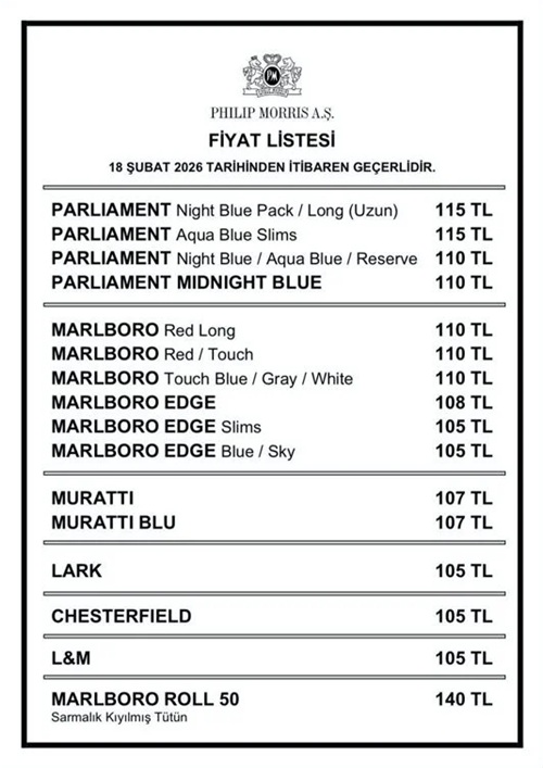 Sigara fiyatlarındaki artış serisine bir yenisi daha eklenirken tiryakileri zorlayan haberler peş peşe geldi. JTI grubunun gerçekleştirdiği fiyat güncellemesinin hemen ardından Philip Morris (PM) grubu da listelerini yeniledi. İlgili zamlı tarife 18 Şubat 2026 tarihi itibarıyla tüm satış noktalarında resmen uygulanmaya başlandı.