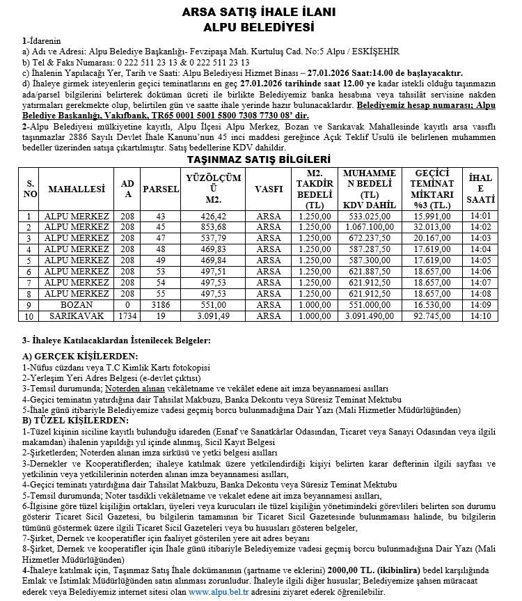 İhale, 27 Ocak 2026 tarihinde saat 14.00’te başlayacak ve her bir taşınmaz için belirlenen saatlerde ayrı ayrı yapılacak. İhaleye katılmak isteyenlerin, geçici teminat bedellerini yatırarak gerekli belgeleri en geç 27 Ocak 2026 tarihine kadar Alpu Belediyesi’ne teslim etmeleri gerekiyor.