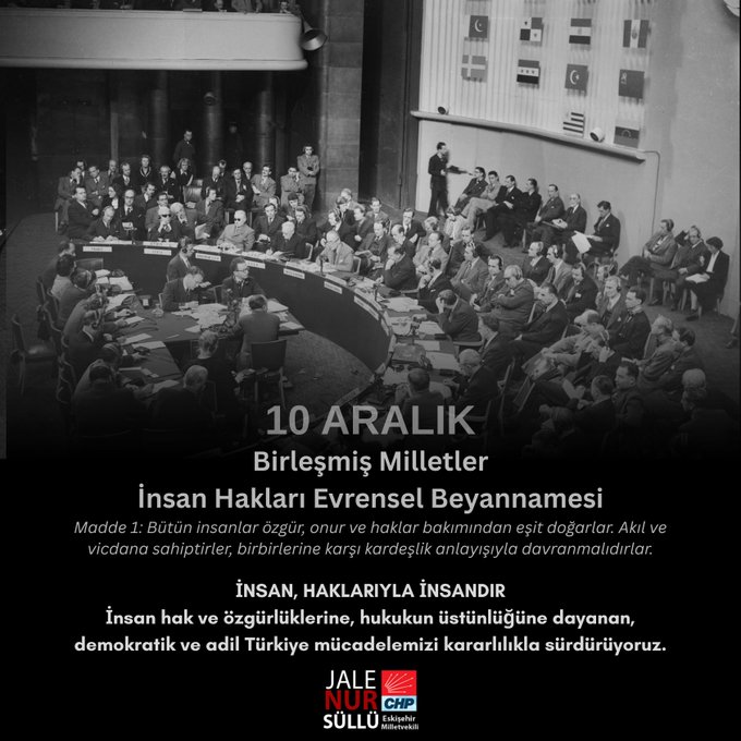 CHP Eskişehir Milletvekili Jale Nur Süllü, 10 Aralık 1948’de Birleşmiş Milletler tarafından kabul edilen Evrensel İnsan Hakları Beyannamesi’nin 77. yıl dönümü dolayısıyla bir mesaj yayımladı.