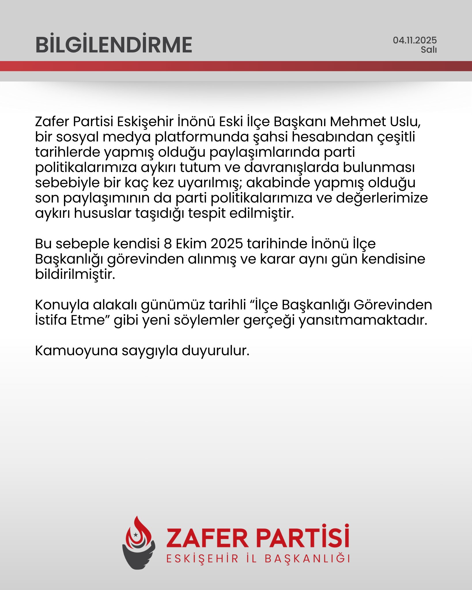 Zafer Partisi Eskişehir İl Başkanlığı, İnönü İlçe Başkanı Mehmet Uslu'nun geçmiş zamanda yaptığı sosyal medya paylaşımlarından dolayı görevden alındığını duyurdu.